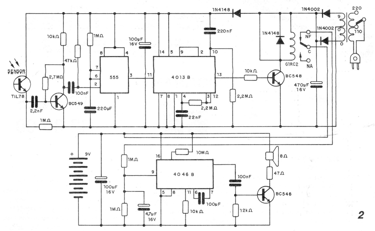 This circuit with an optical path sensor was found in a 1995 documentation. The circuit fires when, for a moment, no light shines on the phototransistor. The circuit has a bistable action given by the 4013 and the control is done by a relay. The circuit includes a battery that powers the circuit in the event of a power failure and a siren with a PLL 4046. The transmitter can be one of the tone-modulated LED circuits that we have in this section.