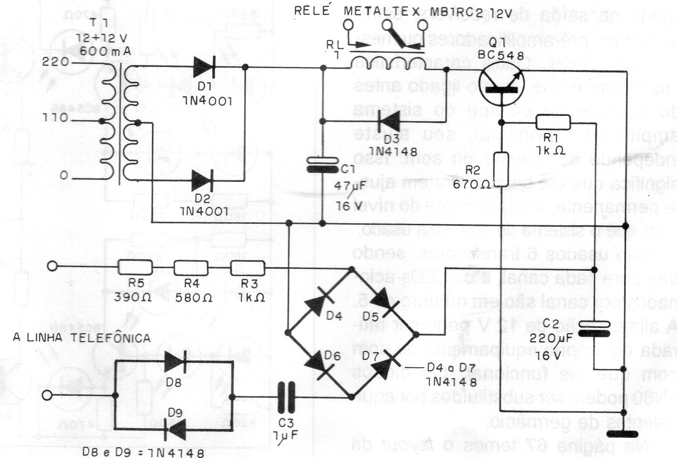 This circuit activates a relay when the phone rings allowing the control of a warning lamp or even a cicada much more powerful than the normal ringing of the phone. The circuit uses a sensitive 12 V relay, and the load fed depends on its contacts.