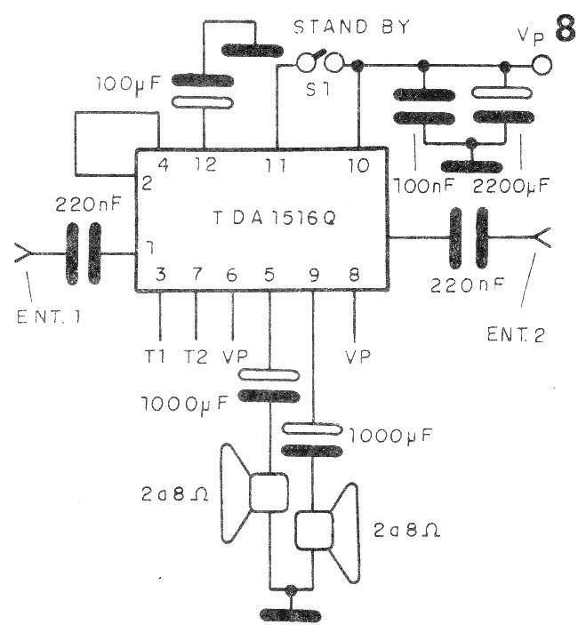 This is a Philips commercial circuit from the 90s. The integrated circuit must have a good heat sink and the source can be 14.4 V or car battery. The circuit has a pass-through range of 20 to 15 000 Hz and an input impedance of 60 k ohms.