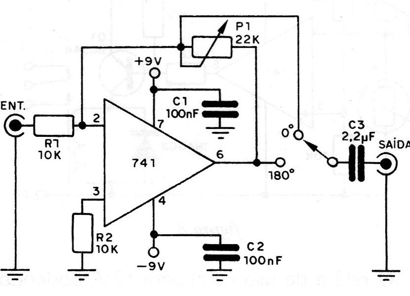 An audio signal is applied to the input of this circuit. Depending on the position of the selector switch S1, an amplified signal of the same phase (O °) or opposite phase (180 °) can be obtained at the output. A possible application for this circuit is in an ambient sound system, as a microphone eliminator. The feedback or acoustic feedback is caused by the input, through the microphone, of the sound reproduced in a speaker. The feedback is unpleasantly manifested as a high-pitched whistle that disappears with the reduction of the amplifier volume or even with the change of the microphone position. To reduce the effects of feedback in auditoriums, a phase inverter can be used, connected between the microphone and the amplifier, as suggested with the 741. With the phase inversion, you can make the speaker signal that affects the microphone, causing feedback, is canceled, as it starts to act as negative and non-positive feedback. The power supply is symmetrical at 9-0-9 V, and the current consumption is quite low. The input impedance of the circuit is of the order of 10 k, a characteristic that must be observed when choosing the microphone or other used signal source.