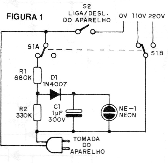 This circuit has an interesting application. If a device with the selector switch in the 110 V position is connected to a 220 V socket, the neon lamp flashes in warning signal warning that it should not be turned on. The circuit does not switch, it only warns that the connection is in danger.