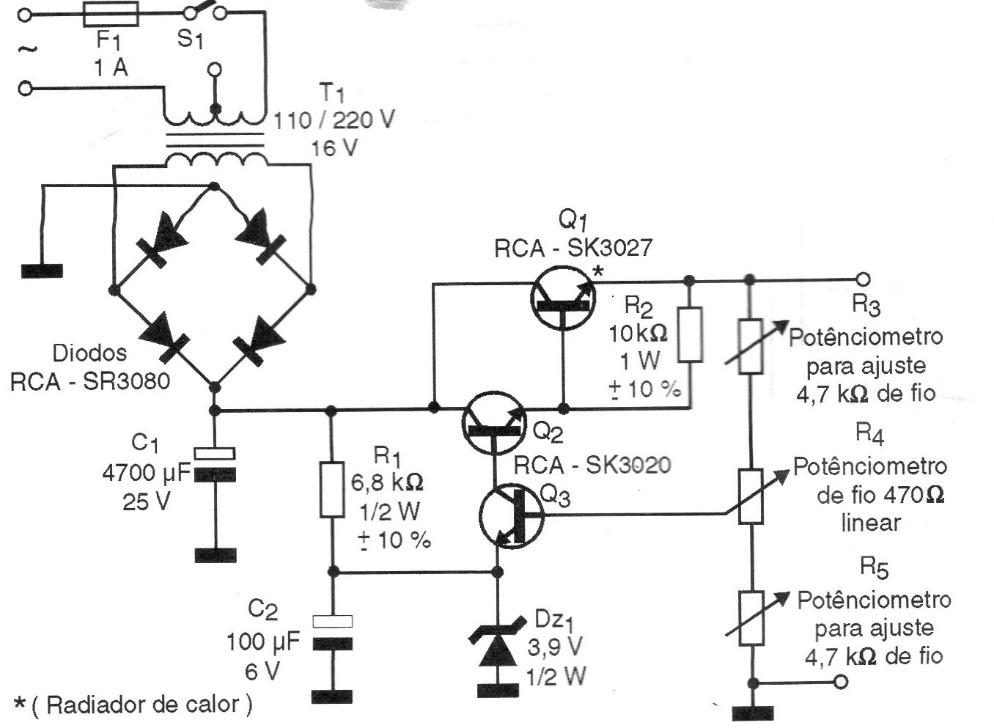 The presented circuit provides voltages from 4.5 V to 12 V with currents up to 1 A. We obtained this circuit in a 1998 documentation. Transistors can be replaced by more common equivalents such as TIP31 for Q1 and BC548 for Q2 and Q3. DZ1 determines the minimum voltage.