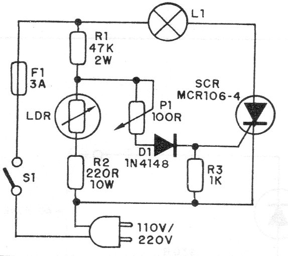 This 1987 circuit has a very interesting concept. It powers a second set of rhythmic lights from the blinks of a first set. The circuit uses a LDR as a sensor and should only be used with incandescent lamps. The SCR must have a heat sink.