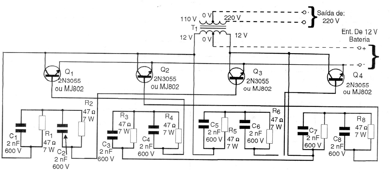 This inverter can reach a power of 300 W depending on the transformer used. In this case, a transformer with 12 V secondary with 10 A. was used. The transistors must be equipped with excellent heat sinks. The circuit is from 1997 documentation.