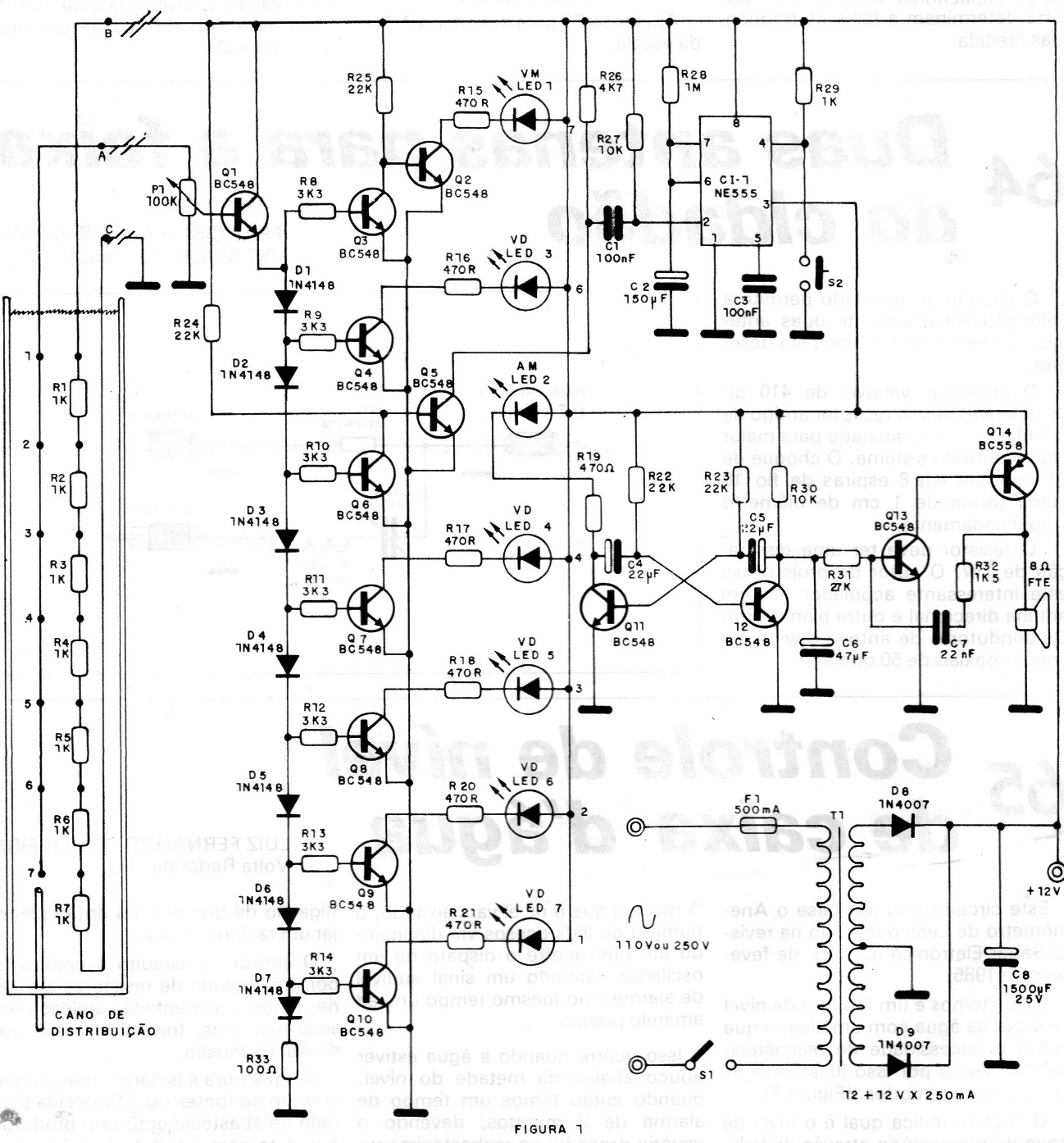 This circuit was found in a 1987 documentation but can be easily assembled today by the components it uses. The circuit has a resistive sensor that is in contact with water at different levels, thus causing the generation of stepped voltages, which are indicated by an LED bar. The circuit must be powered by a source with a transformer for safety reasons. The scale adjustment is done in P1.