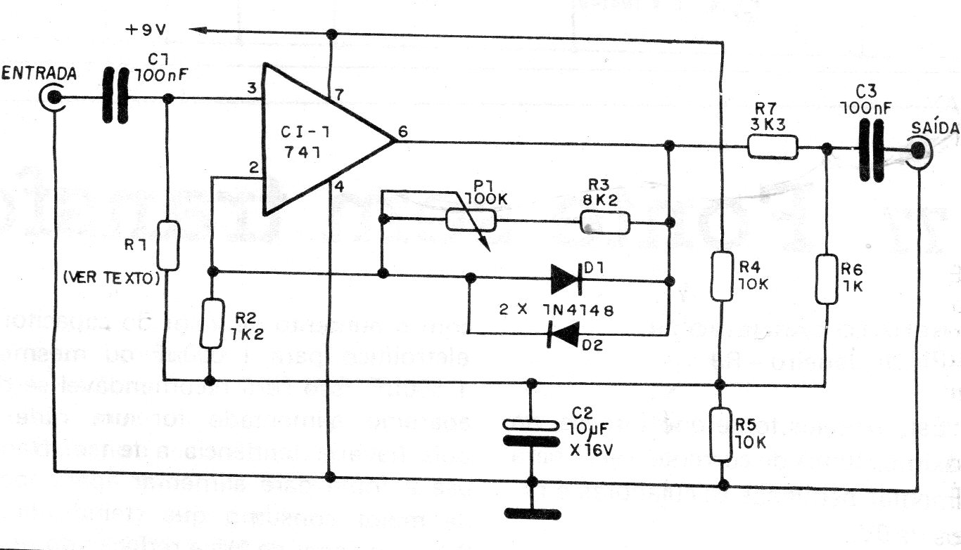 We found this circuit in an old documentation, but it can be easily assembled, as it is based on the very common 741 integrated circuit. The input and output cables must be shielded, and the adjustment of operation is done in P1 that can be installed on a pedal. The supply can be done with a 9 V battery, as the consumption is very low.