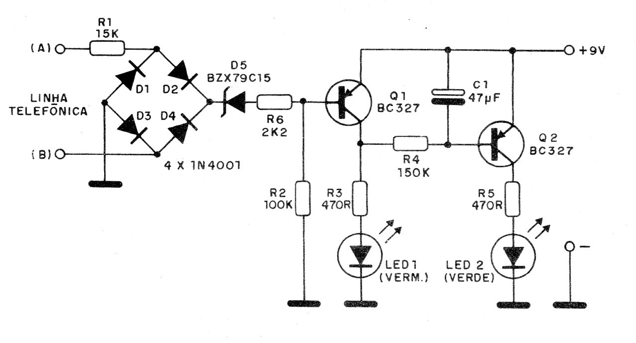 The presented circuit monitors a line indicating if it is busy if there is an extension. The circuit is powered by batteries or 9 V battery and the indication is made through LEDs. The circuit is connected to the analog telephone line. The components used are all common.