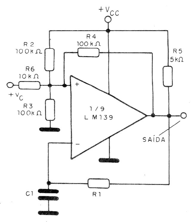 This 1992 circuit uses a common LM139 comparator today, but it can be built with equivalent amplifiers from the same series. The voltage from 3 to 12 V depends on the operational and the gain is given by R4. R1 and C1 determine the operating.