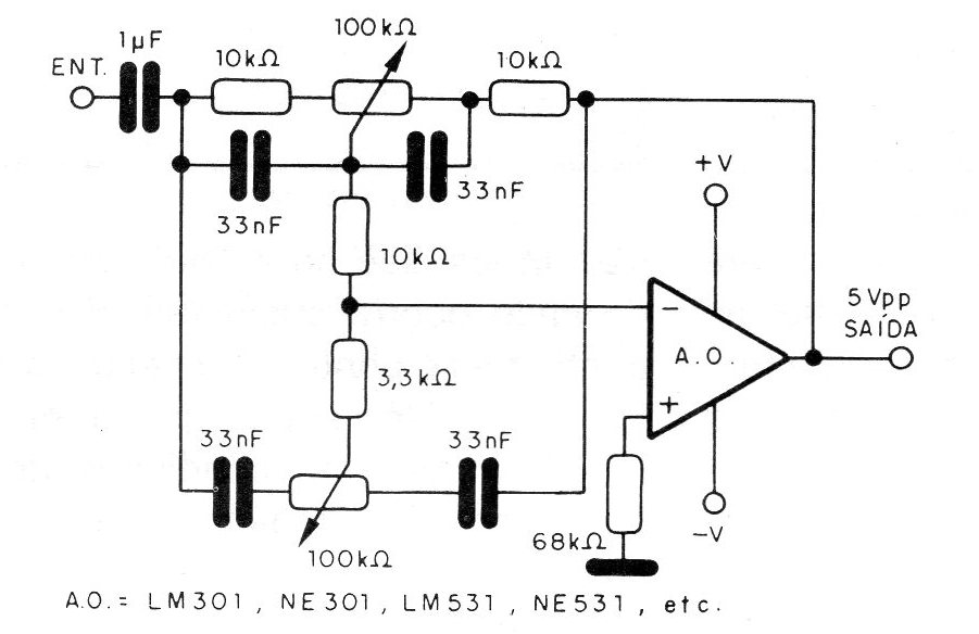 The tone control in the figure below can be implemented with almost any operational amplifier. The power supply must be symmetrical and the potentiometers linear. The supply voltage can be between 6 and 15 V, according to the operational amplifier used.