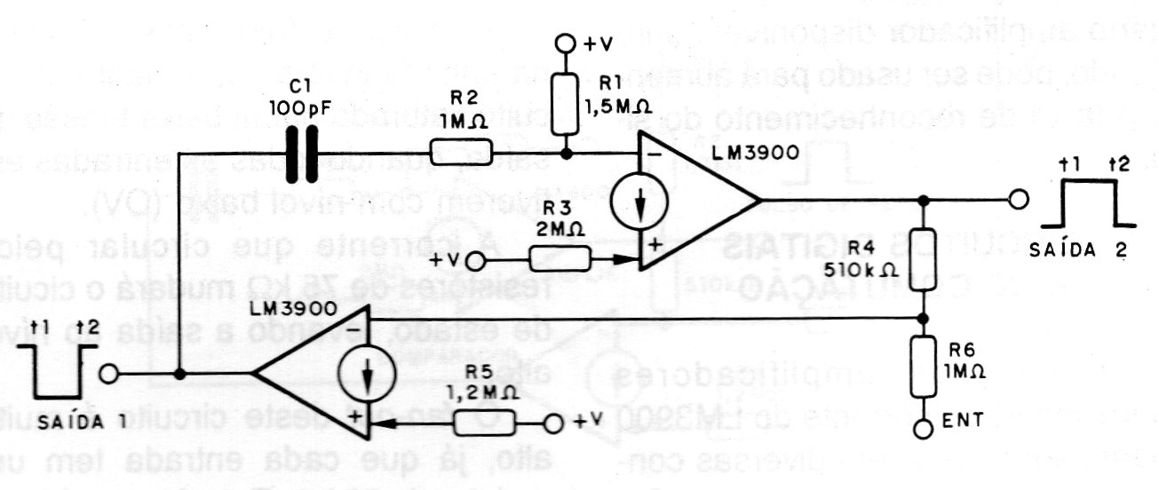 The circuit in the figure combines a multivibrator with a comparator, so that the trip only occurs when the input level exceeds a certain value. This application can be interesting in an oscillating circuit, where the generated signal, upon reaching a certain level, causes the production of a reset pulse. In the indicated circuit, the trip occurs when the input voltage reaches approximately 80% of the supply voltage, a value that is given by the relationship between R6 and R5.