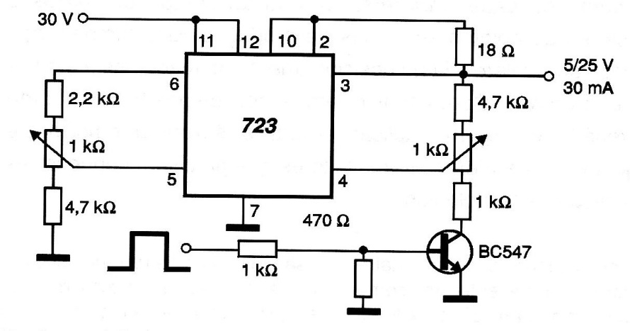 This circuit only generates the voltage that must be pulsed in an EPROM to make its recording. The pulsar can be controlled by a logic circuit connected to the input when level 1 then applies the pulse. This circuit should generate the pulse in the required width for each type of EPROM that will be recorded. The circuit is entered with a voltage of 30 V and the exact pulse voltage must be adjusted in both trimpots. It also serves as the basis for a stabilized power supply of excellent quality by simply adding power steps with transistors.
