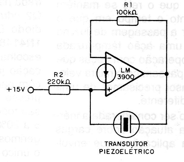 This circuit is suggested by National Semiconductor and is based on the LM3900, a quadruple transconductance operational amplifier. The operating frequency of the circuit is that of the transducer resonance and excellent audio power is achieved with this type of element. The 15 V supply comes from a non-symmetrical source. The other operational ones of the LM3900 integrated circuit can be used for other applications or to generate signals for other transducers.