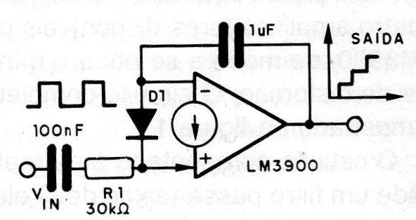 A stepped waveform is obtained with the circuit shown in the figure, which uses only one amplifier. In this circuit we have two stair steps for each cycle of the input signal. To obtain only one step per cycle of the input signal, simply remove diode D1.