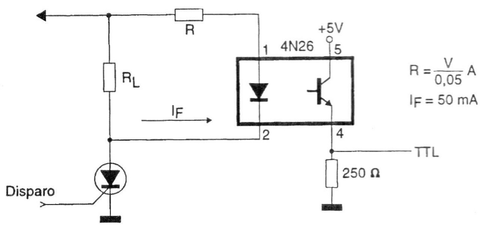 This coupler allows the triggering of a TTL port or flip-flop from an SCR. The resistor R must be calculated by the formula next to the diagram, depending on the supply voltage of the system to obtain a current on the LED of the order of 50 mA.