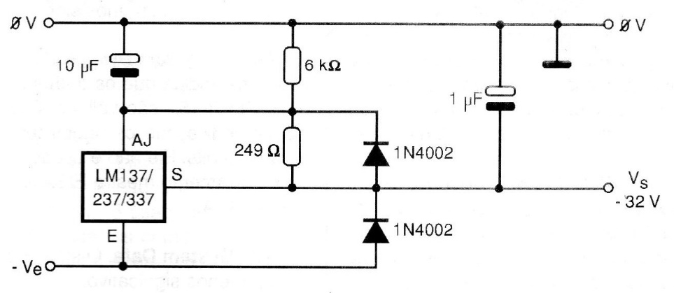 This circuit can supply negative voltages of up to 32 V with high current intensity (up to 1 A), based on the LM137 regulator and others in the same series. The output voltage depends on the relationship of values between the two resistors used in the circuit. This configuration is suggested by National Semiconductor. The input must have a voltage of at least 2 V greater than that desired at the output.
