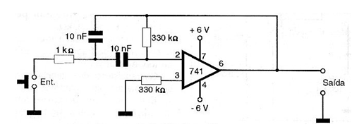 A frequency range determined by the network of resistors and capacitors with negative feedback and input passes through this circuit with virtually no attenuation. However, frequency signals outside this range are strongly attenuated. The values of the components used can be changed according to the frequency range you want to tune. We observed that the selectivity of the circuit is not high, which must be considered in certain applications. The complete circuit of this filter is shown in the figure and makes use of a symmetrical power supply.