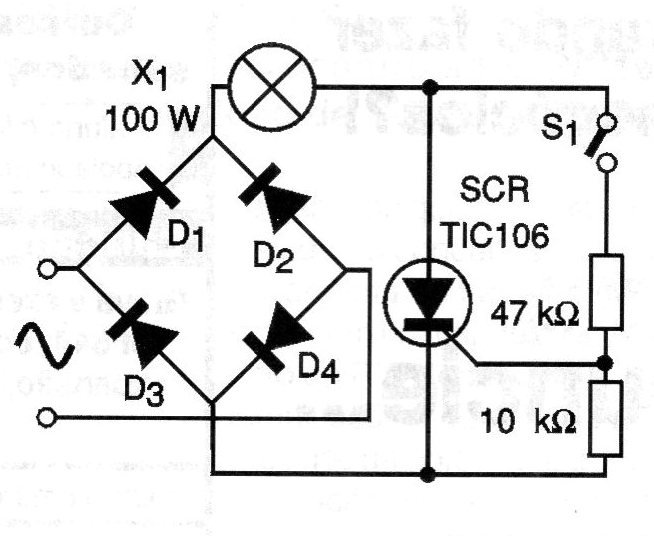 A load of up to 3 amps can be controlled by this circuit from a low current switch (reed-switch or other) that does not support more than a few milliamps. The SCR must be equipped with a heat radiator and its suffix will depend on the power network. For the 110 V network use the TlC106-B, and the 1N5404 as diodes. For the 220 V network use the TIC106D, and the 1N5407 as diodes. For currents up to 1 A, the 1N4004 / 4007 diodes fit perfectly.