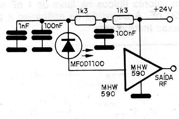 This circuit is suggested by Motorola and makes use of a phototransistor with its own encapsulation for connection in plastic optical fibers of 1,000 microns. Using an MFOE76 as a transmitter, this detector allows the use of optical fibers up to 100 meters in length in the transmission of TTL data. The supply is 5 V and the circuit uses one of the 4 triggers available in a 74L8132. The recommended operating frequency for the circuit is 7.5 kHz.