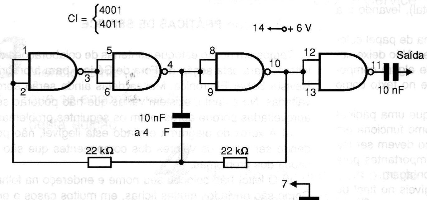 The signal injector illustrated in the figure uses a single integrated circuit and generates rectangular signals rich in harmonics. The supply can be done with voltages between 5 and 12 V, but we suggest 6 V, which corresponds to the use of 4 common batteries. The negative of the injection is the negative pole of the batteries, and the capacitor can be changed to obtain a frequency according to the desired application.