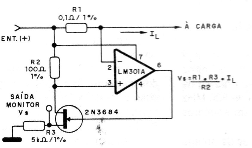 This circuit, suggested by National Semiconductor, provides an output voltage proportional to the current in the load (IL). The proportionality ratio depends on the resistors according to the formula given next to the diagram in the figure. The field effect transistor is used as a buffer, and the operational amplifier must be symmetrical. Observe the tolerance of the components for greater precision in the output voltage in relation to the monitored current.