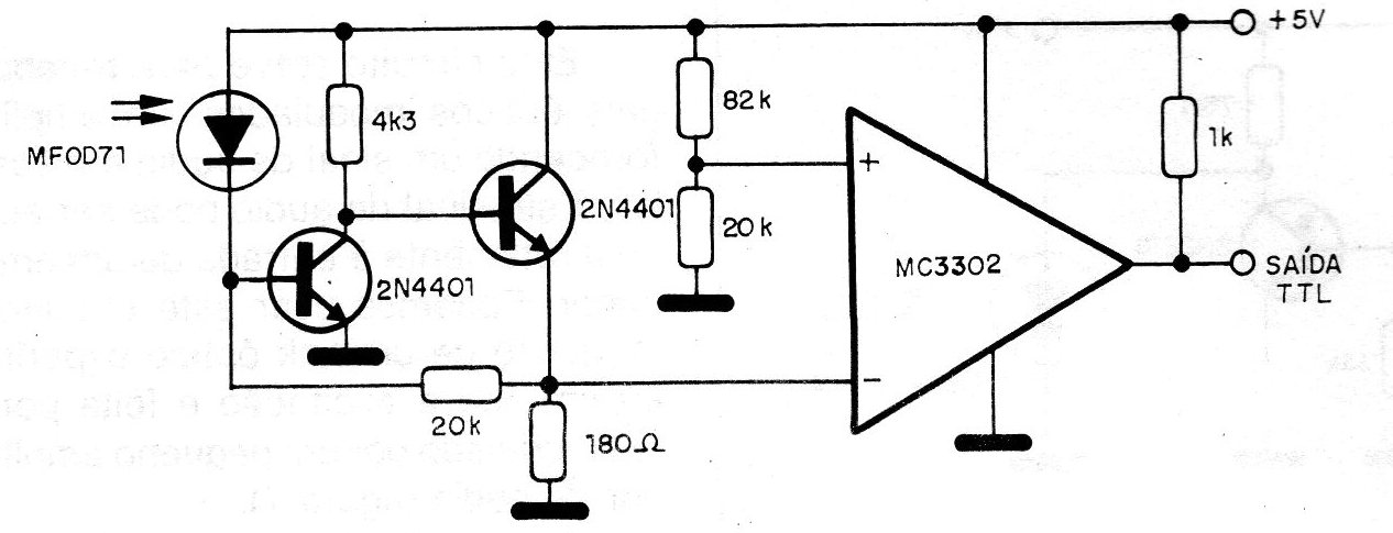 This circuit is suggested by Motorola, employing a photodiode with housing designed for coupling in 1000micron plastic optical fibers. The photodiode has a response time of 5 ns and is compatible with the MFOE76 emitter also from MotoroIa. The 20k resistor at the operating input can be variable to adjust the sensitivity of the circuit. The current in the detector is 10 A for a 4 meters long cable, using an MFOE76 emitter with an excitation current of around 50 mA.