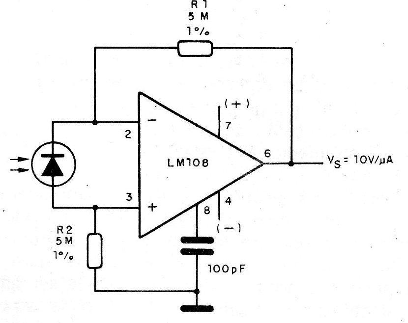 This circuit is suggested by National Semiconductor and has an excellent gain, for a photodiode as a transducer. We have 10 V of signal for each microampere of current increase in the photodiode. The resistors are accurate to maintain the indicated response and the power supply must be symmetrical. One of the main characteristics of this circuit is that the leakage current that increases with the temperature does not affect the circuit appreciably, since it responds to the short-circuit current of the diode.