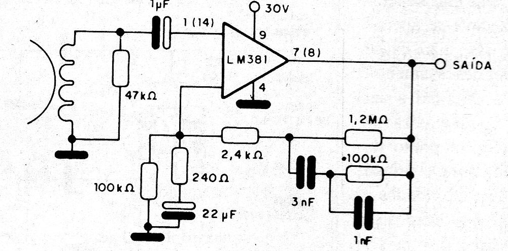 The integrated circuit used is uncommon today. The numbering in parentheses is for the second channel. Despite the high supply voltage, consumption is very low. Care must be taken to avoid pick up hum.