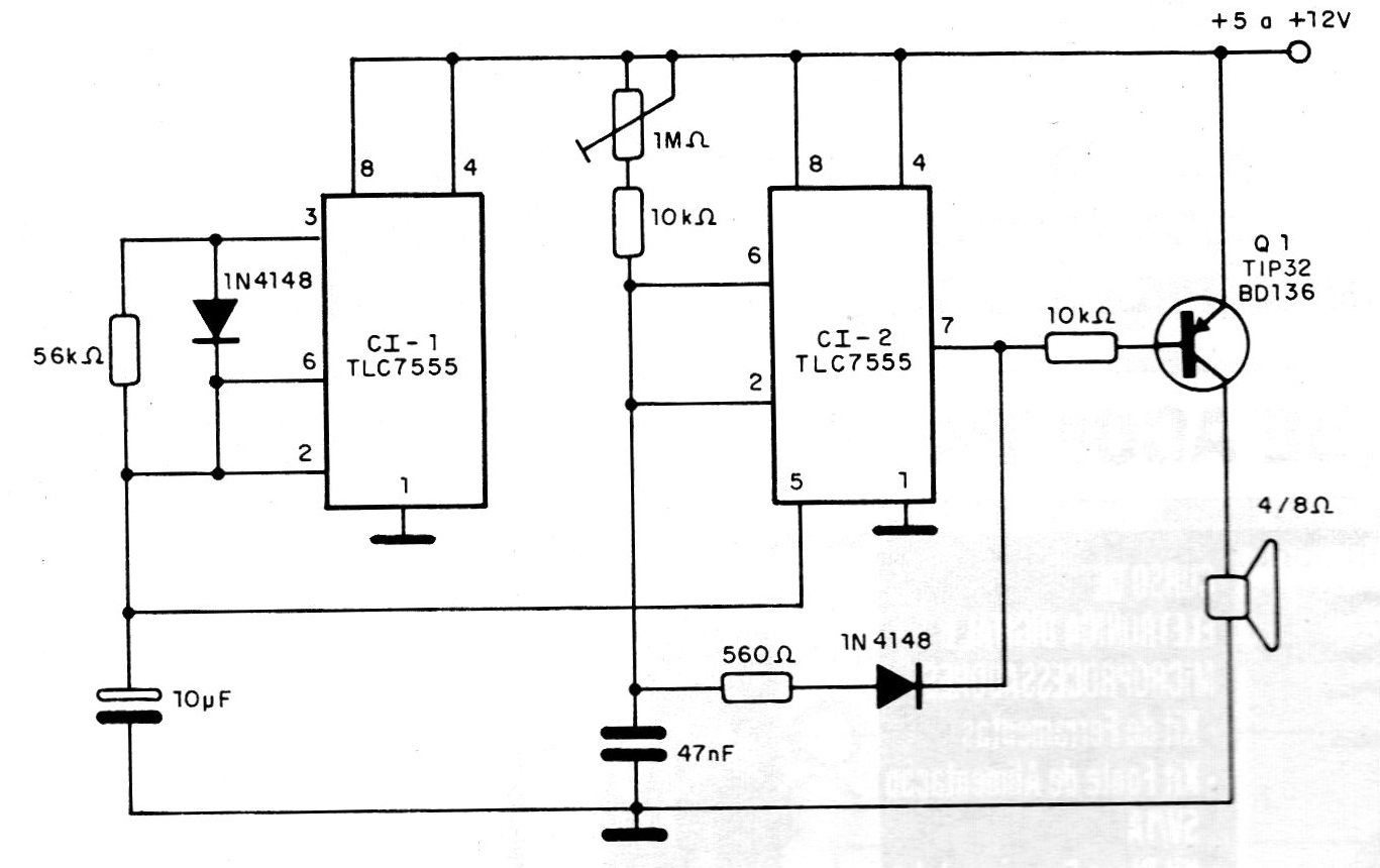 With the circuit shown in the figure we have a frequency modulation which is produced by a sawtooth signal generated by C1. The frequency of this oscillator is approximately 1 Hz, with a very fast descent time, given by the diode between pins 3 and 6. This signal modulates the second oscillator, formed by CI2, whose frequency is in the audio range, which can be adjusted in the trimpot. Also, in this circuit we have several options for the output stage, ranging from the very low power configuration with ceramic transducer, to the high power, with a Darlington transistor.