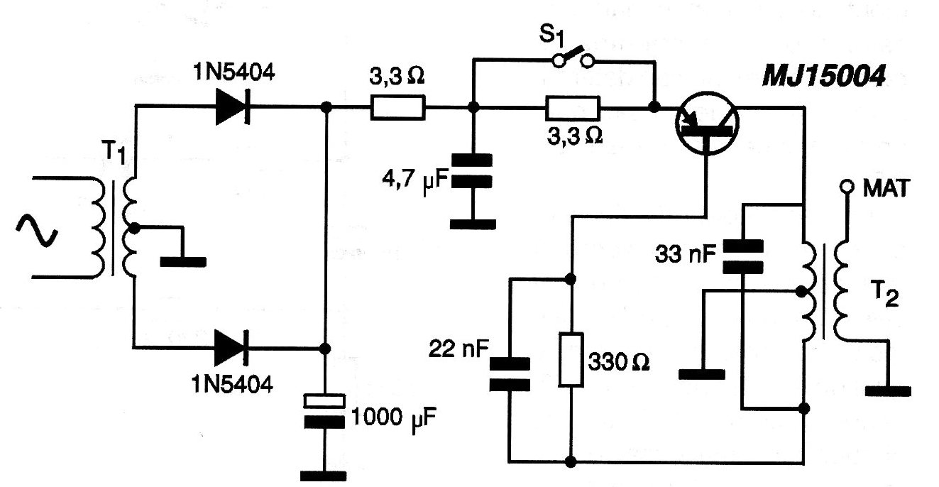 This circuit generates voltages of tens of thousands of volts for projects such as electrostatic filters and physics experiments. The transformer T1 has a 24 V secondary with a current of 3 A and the transistor must have an excellent heat radiator. The T2 transformer is an old TV flyback in which we have wound 10 + 10 rounds of common rigid wire 22 with plastic cover as a primer. The 3.3 ohms resistors are made of wire and the high voltage can exceed 30,000 volts, so it is necessary to be careful when using such a device.