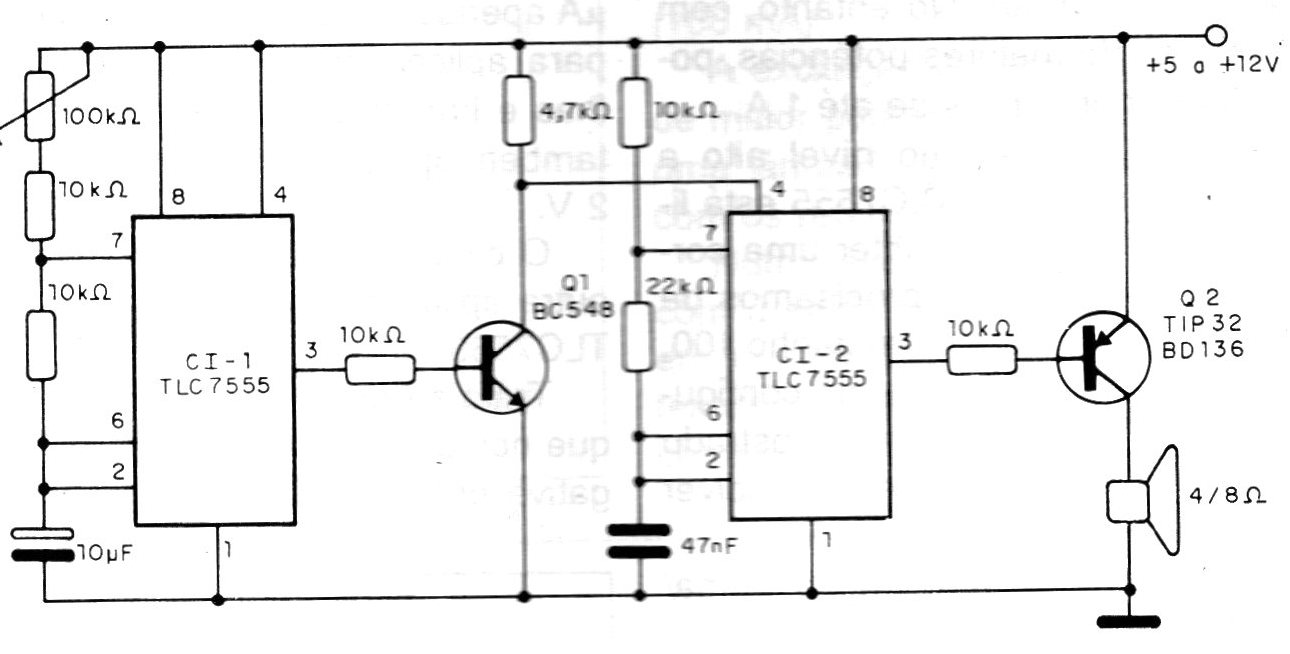 The figure circuit is a modulated tone generator, with the effect of interval beeps. The frequency of the beeps is given by the resistors of 10 k ohms, P1 and by the electrolytic capacitor of 10 uF, which can be changed according to the effect that the reader desires. In this circuit, the load, a small speaker, is excited by a transistor, however, we can have the direct excitation of a ceramic transducer, as suggested in previous projects. Note that resistors R1 and R2 of the slow oscillator will determine the intervals and duration of the beeps. For the indicated version, as the beeps are of short duration, the power consumption is very low, even when we excite a small speaker. The modulation of the previous circuit is done to interrupt the sound, which characterizes the b¡p.