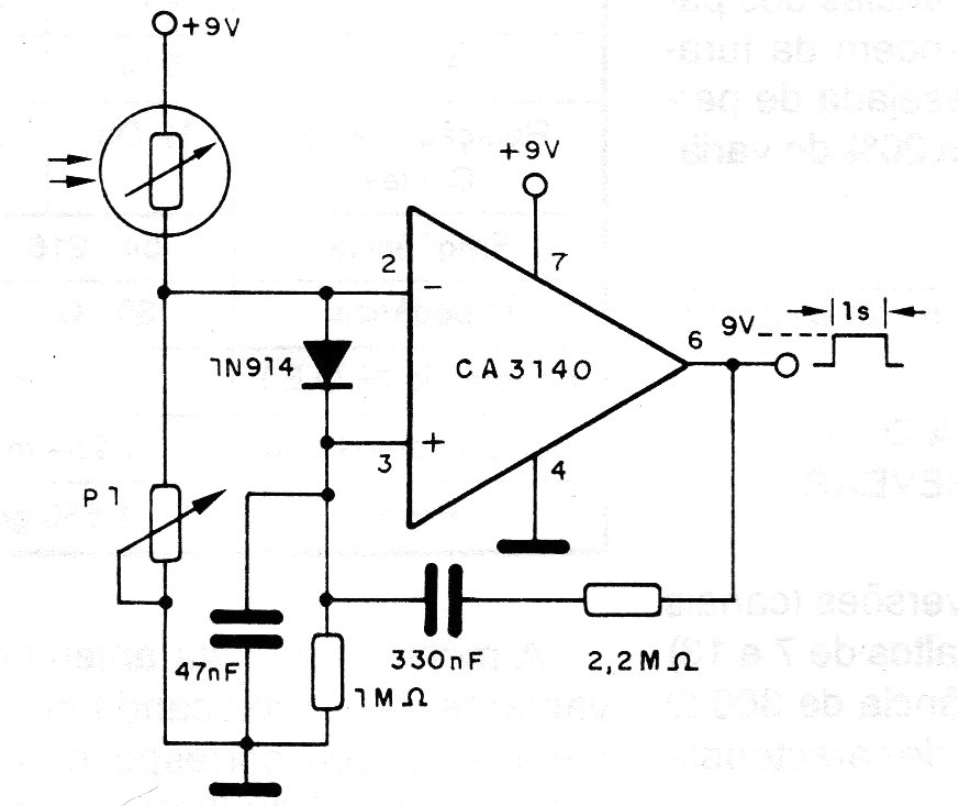 This circuit shown in the figure produces a pulse of constant duration at its output, of the order of 1 second when the LDR receives a short pulse of light. Potentiometer P1 must have the same resistance as the LDR in operating conditions without lighting. The power supply does not have to be symmetrical. The capacitors can be changed to obtain different activation times. The circuit must not receive pulses of light of duration longer than the time of the output pulse. The amplitude of the output pulse is in the same order as the voltage of the power supply.
