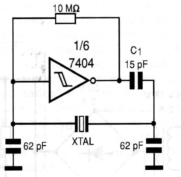 This oscillator makes use of one of the inverters of an integrated circuit 7404. With circuits of the normal series its frequency can go up to about 7 MHz. With ICs of the LS series the frequency can be much higher.