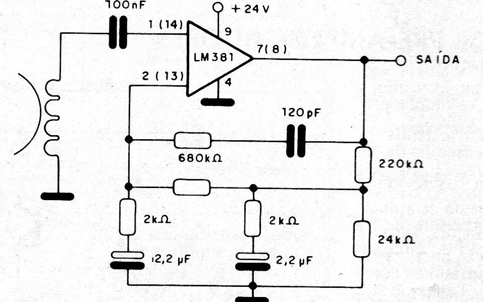 This circuit uses an amplifier from National Semiconductor, uncommon nowadays. The numbers in parentheses are for the second channel. The circuit is suitable for old tape recorders.