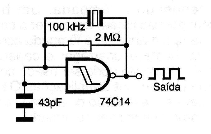 This oscillator uses one of the four ports of a 74C14 integrated circuit and can generate 100 kHz signals controlled from a crystal. The 43pF capacitor must be ceramic and the power must be supplied with a stabilized voltage of 5 V.