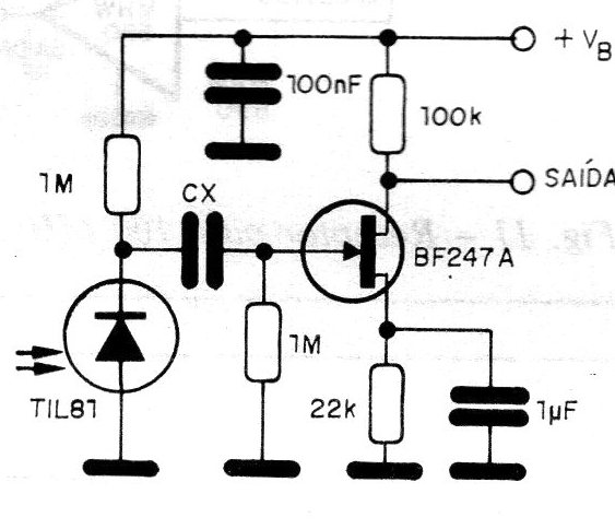 This circuit detects frequency modulated signals that are not received by a photo sensor. The circuit is designed to operate at frequencies up to 10 kHz and is based on a field effect transistor. The supply can be done with voltages in the range of 9 to 20 V and the capacitor Cx must be selected according to the operating frequency, having typical values in the range of 1 nF to 100 nF. The application suggestion is from Texas lnstruments.
