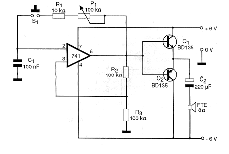 This circuit is basically the same as the previous configuration (CB15616E) with a power stage with complementary transistors that allow the direct excitation of a low impedance speaker. In the figure we have the complete circuit of this oscillator that requires the use of a symmetrical source in its supply. The frequency depends on the 100 nF capacitor and is controlled by the 100k ohms potentiometer. The capacitor can be changed according to the frequency range to be generated. Power transistors must be mounted on heat radiators. These radiators must be larger the greater the voltage used in the supply.