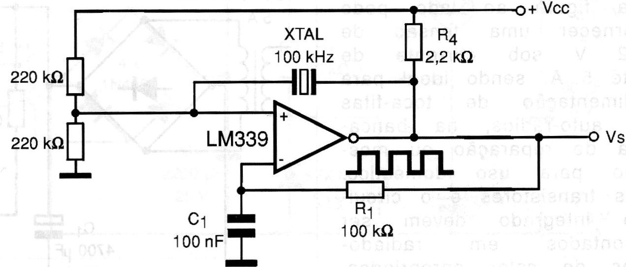 In this circuit, which uses one of the four comparators of an LM339 (or LM139 or 239), capacitor C1 and resistor R1 must have a time constant that is equivalent to a few times the cycle of the signal produced in order to guarantee an active cycle 50%. The circuit can generate signals up to a few megahertz, depending on the crystal.