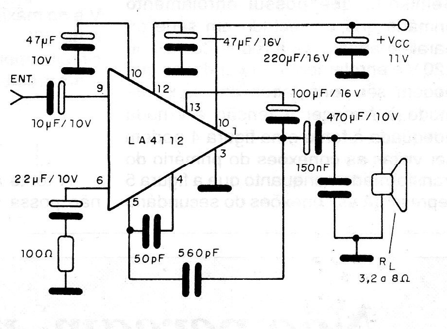 This amplifier is suggested by Sanyo, for radio and recorder applications and makes use of a single LA4112 integrated circuit. The power depends on the load and is maximum with 3.2 ohms. The integrated circuit must be fitted with a small heat radiator. The resistors are 1/8 W and the electrolytic capacitors have the minimum working voltages indicated in the diagram itself.