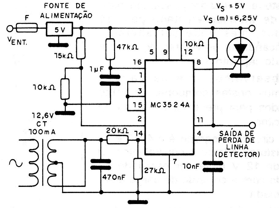 This circuit is suggested by Motorola as the basis for the MC3324 A integrated circuit and has a line loss detector output. The system is of the Crossbar type in which an SCR is triggered when the overvoltage occurs, thus shorting the output quickly and avoiding problems for the fed load. The SCR must be chosen according to the characteristics of the source and, therefore, also the fuse. The MC3324 consists of a double voltage comparator designed especially for supervising power supplies. This integrated can operate with voltages from 4.5 to 40 volts and its output can supply a current of 300 mA (pin 8 and pin 10) for the triggering of SCRs.
