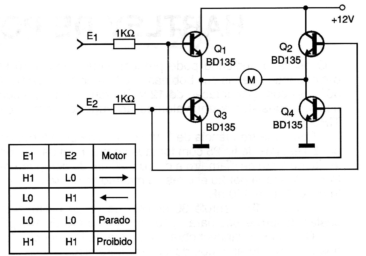 A motor of up to 500 mA can be controlled by the logic levels applied to the inputs of this circuit, according to the table given next to the diagram. For higher currents, transistors such as TlP31 or even TIP41, and even Power-FETs can be used. The transistors must be equipped with heat radiators and the circuit works with voltages from 6 to 12 V. The input is compatible with TTL and CMOS logic. The circuit can be used as a shield for microcontrollers.
