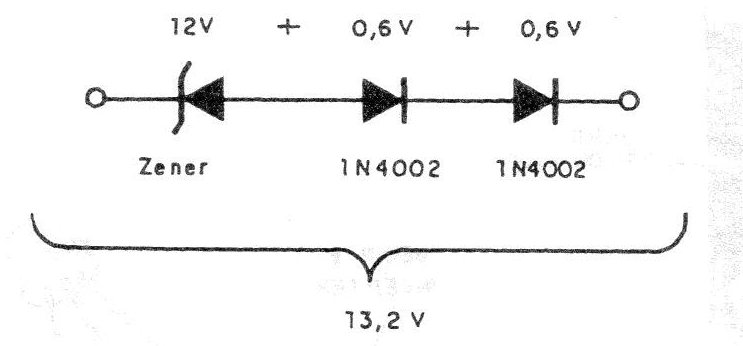 The voltage of 13.2 V is closer than what we find in a car battery than 12 V. Thus, a 13.2 V zener can be used in a source that supplies automotive equipment more properly. A zener of this type can be improvised with a 12 V zener and two common diodes, as shown in the figure. Using the same reasoning, we can increase the voltage of any zener in 0.6 V steps.
