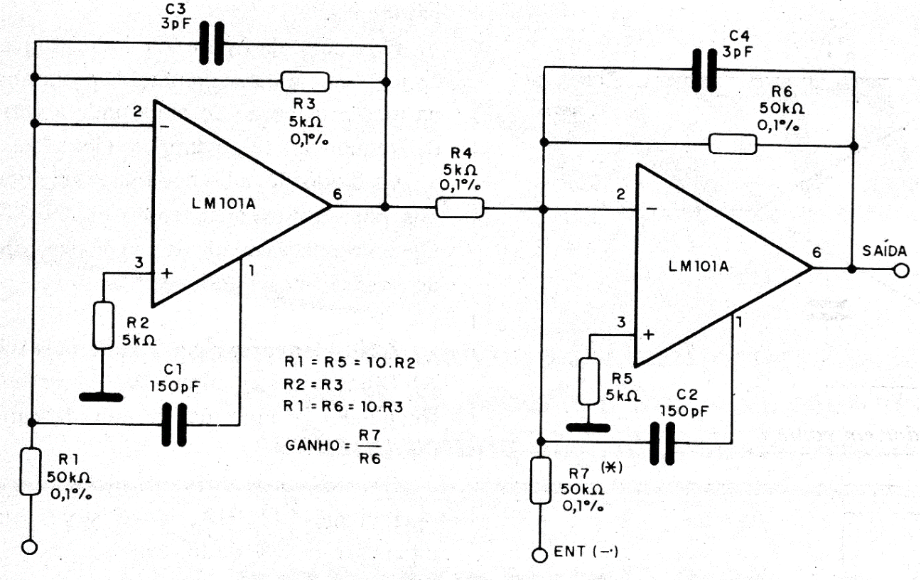 The gain of this amplifier is given by the components indicated in the formulas next to the diagram. The power supply must be symmetrical and equivalent operational amplifiers can be used.