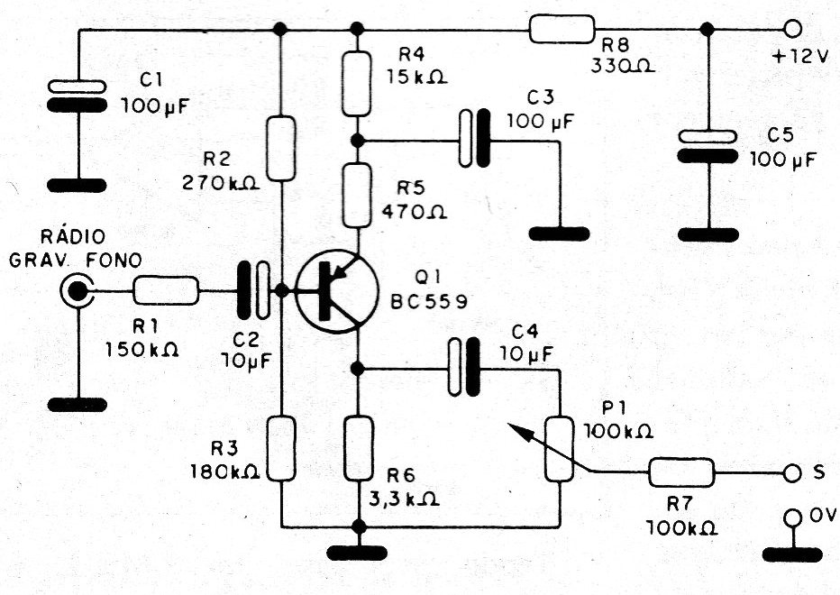 This circuit uses only one transistor and has an excellent gain for the type of signal source indicated. The circuit can also be used with piezoelectric microphones that have the same characteristics. The consumption is very low, on the order of 1 to 2 mA.