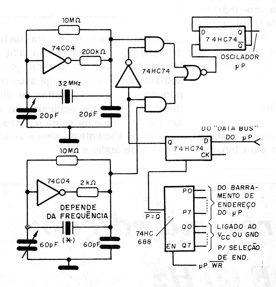 The circuit shown allows the change of the clock speed of a microprocessor to reduce consumption. What is done is to choose a lower operating speed, using a second switched clock oscillator. The crystal of this oscillator is chosen according to the new desired speed. The circuit is suggested by National Semiconductor.