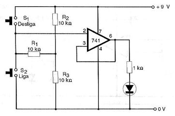 What differentiates this circuit from the previous one (CB15613E) is the non-need to use a symmetric source. This allows the supply to be even made with a lower voltage. In the figure we have the configuration that also activates an LED indicator. To obtain the reference voltage equal to half the supply voltage, a divider with resistors R2 and R3 is used. The values of these resistors are not critical and since as they are the same, they can typically be in the range of 10k to 47k ohms. In this case too, it is possible to use an excitation step with a transistor to control higher power loads, such as, for example, a relay.