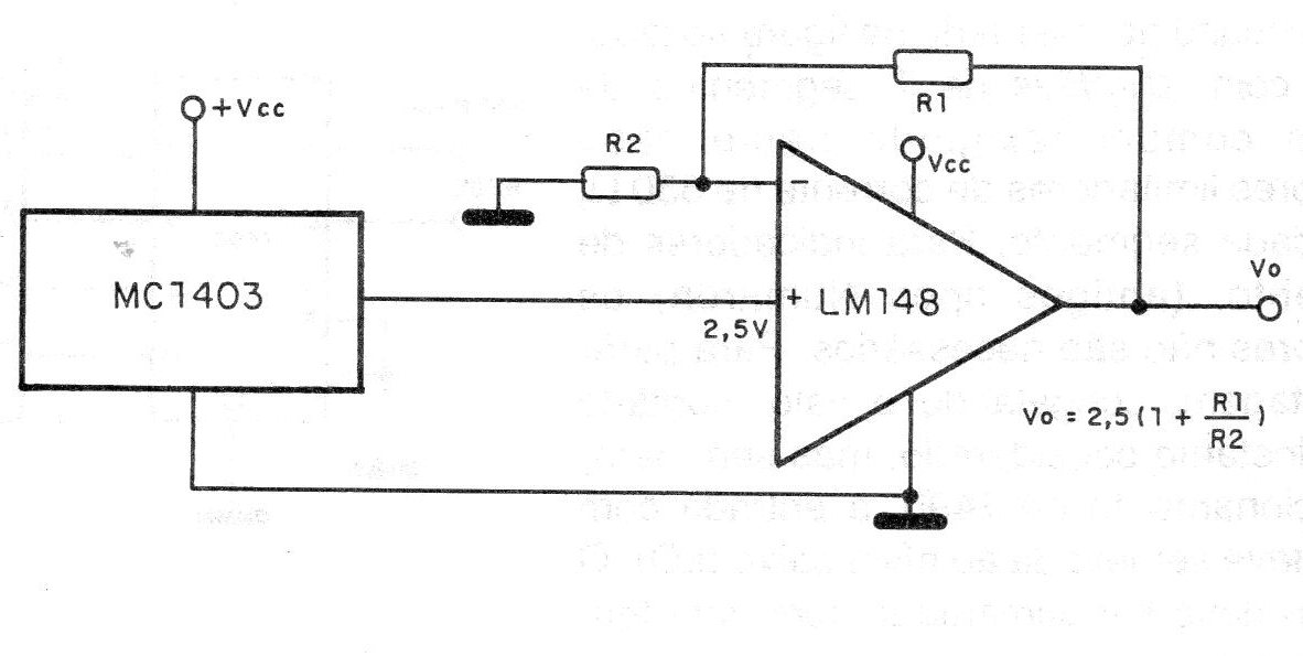 This circuit is suggested by Motorola and consists of a voltage reference based on an MC1403. The MC1403 integrated circuit consists precisely of a voltage reference having, in addition, an operational amplifier LM148 (or equivalent), which serves as a buffer and whose gain determines the final reference voltage. This voltage depends on R1 and R2 and can be calculated from the formula given next to the diagram. The power supply does not have to be symmetrical.