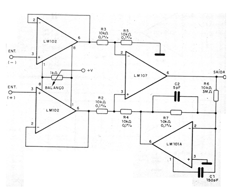 This amplifier with very high input resistance has variable gain and must be powered by a symmetrical source. The circuit has a balance control and other operational amplifiers can be used. The precision resistors are to guarantee the symmetry of the signals.