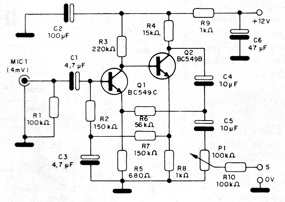 This circuit uses only two transistors, the first being low noise, being indicated for dynamic microphones. The consumption is very low, on the order of 1 to 2 mA, and the utmost care must be taken with the layout of the board and the shielding of the signal cables.