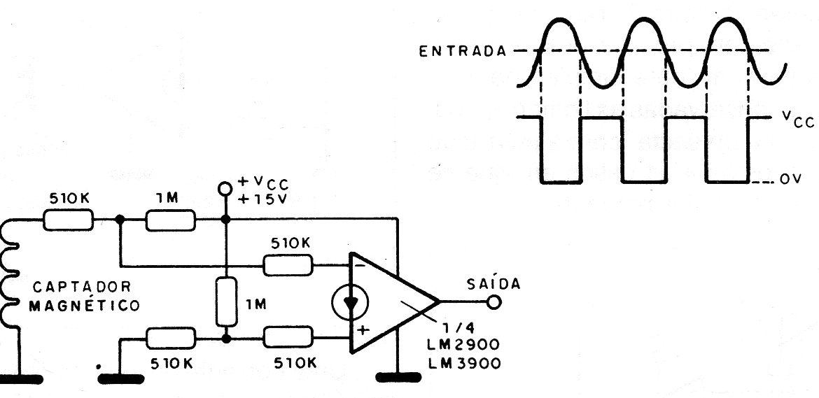 This circuit consists of a “zero crossing detector” that provides a rectangular output signal whose transitions coincide with the zero crossing of an input sinusoidal signal. This circuit is ideal for use in power controls with SCRs and triacs, controlling loads at from signals obtained from a magnetic transducer. Speed controls for AC motors can be implemented based on this circuit.