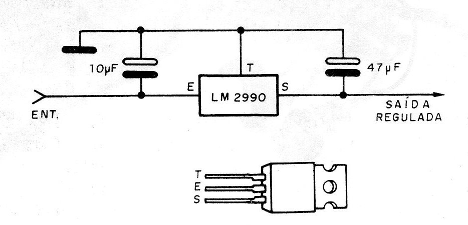This circuit is suggested by National Semiconductor and makes use of the negative regulator LM2990 which is available in voltages of 5, 12 and 15 volts (according to suffix - Ex: LM2990T - 12 = 12 V). The maximum output current is 1 ampere and the voltage drop in the integrated circuit is typically 0.6 to 1 A. The input voltage can range from - 26 V to + 0.3 V.